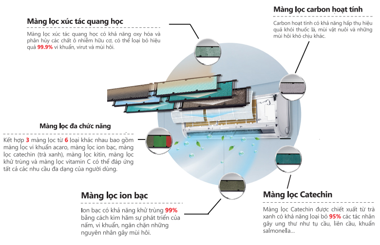 Điều hoà Gree 2 chiều 24000BTU GWH24PC-K6D1B4 có thể xem như một thiết bị lọc không khí hiệu quả, đem đến không gian sử dụng điều hoà trong lành và an toàn hơn với sức khoẻ người dùng. Máy được trang bị màng lọc có mật độ cao hơn so với các loại mật độ thông thường, giúp ngăn ngừa hiệu quả các loại bụi nhỏ và phấn hoa có trong không khí, mang đến làn gió khoẻ mạnh tự nhiên.