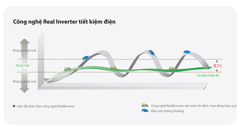 Máy điều hoà Gree GWH24PC được trang bị công nghệ Real Inverter – Đây là công nghệ độc quyền mà chỉ có ở sản phẩm của Gree. Nhờ công nghệ này giúp cho máy nén có thể hoạt động ở tần số cực thấp mang lại khả năng tiết kiệm điện hiệu quả, điều hoà hoạt động êm ái, bền bỉ và kiểm soát nhiệt độ một cách chính xác nhất. Sử dụng điều hòa inverter thiết bị được tích hợp tính năng tiết kiệm điện là xu hướng tiêu dùng của khách hàng hiện nay.