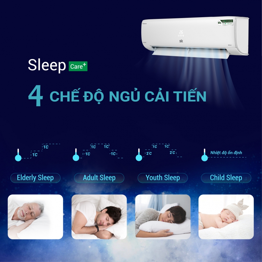 SK Series Gold không chỉ có 1, mà đến 4 chương trình nhiệt độ ban đêm phù hợp với 4 nhóm tuổi người dùng. Mỗi chương trình được thiết kế mặc định kéo dài 8 tiếng, và tự động tăng/giảm khoảng nhiệt phù hợp sau mỗi 1 giờ. Người dùng có thể dễ dàng chọn đường cong nhiệt phù hợp bằng cách bấm nút SLEEP trên điều khiển để lần lượt chuyển các chế độ:
